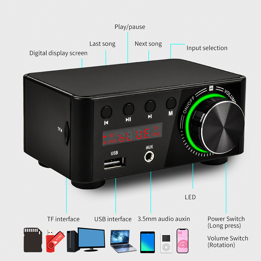 Mini Digital HiFi Bluetooth 5.0 Power Class D Am-plifier Audio Amp 50W*2 Home Theater Car Marine USB TF-Card AUX In