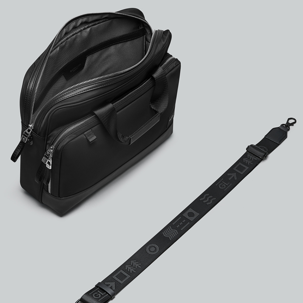 Constructed from recycled vegan leather, our Wörk briefcase is a sleek and durable option for the office. It fits a 16" laptop and has separate pockets to keep your documents organised. Use the adjustable and detachable strap — subtly woven with symbols referencing our Corporate Coast collection — or slip it over your luggage handle using the back strap.