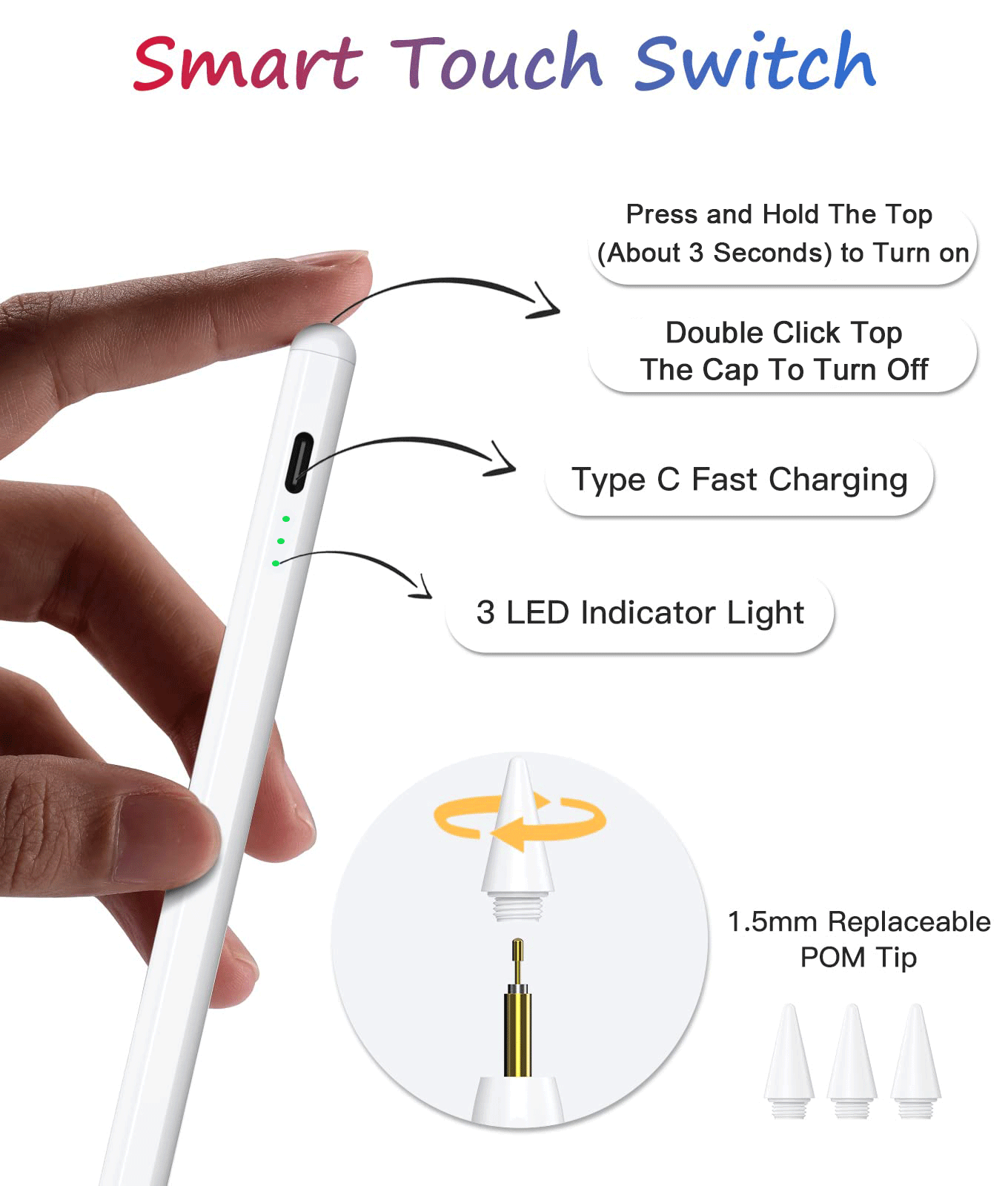 Press and Hold The Top (About 3 Seconds) to Turn on, Double Click Top The Cap To Turn Off.