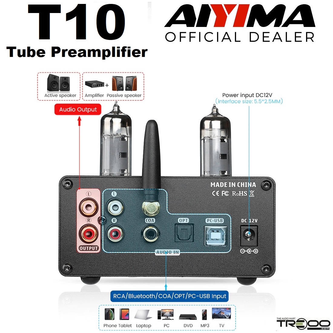 AIYIMA TUBE-T10 (T10) Wireless Bluetooth Receiver/Streamer, Coaxial / Optical / USB DAC & Tube Preamplifier (Official local stock - SG/UK plug)