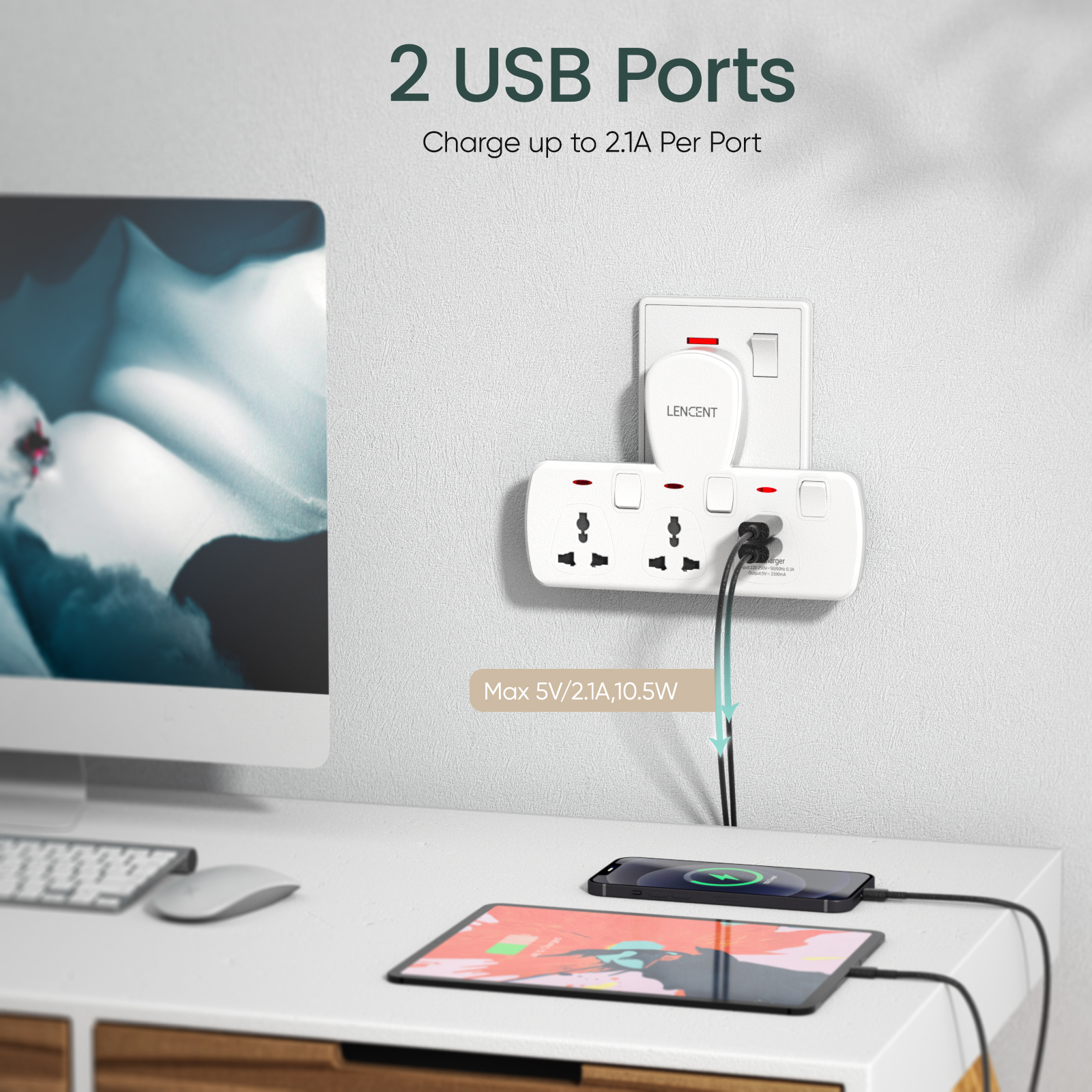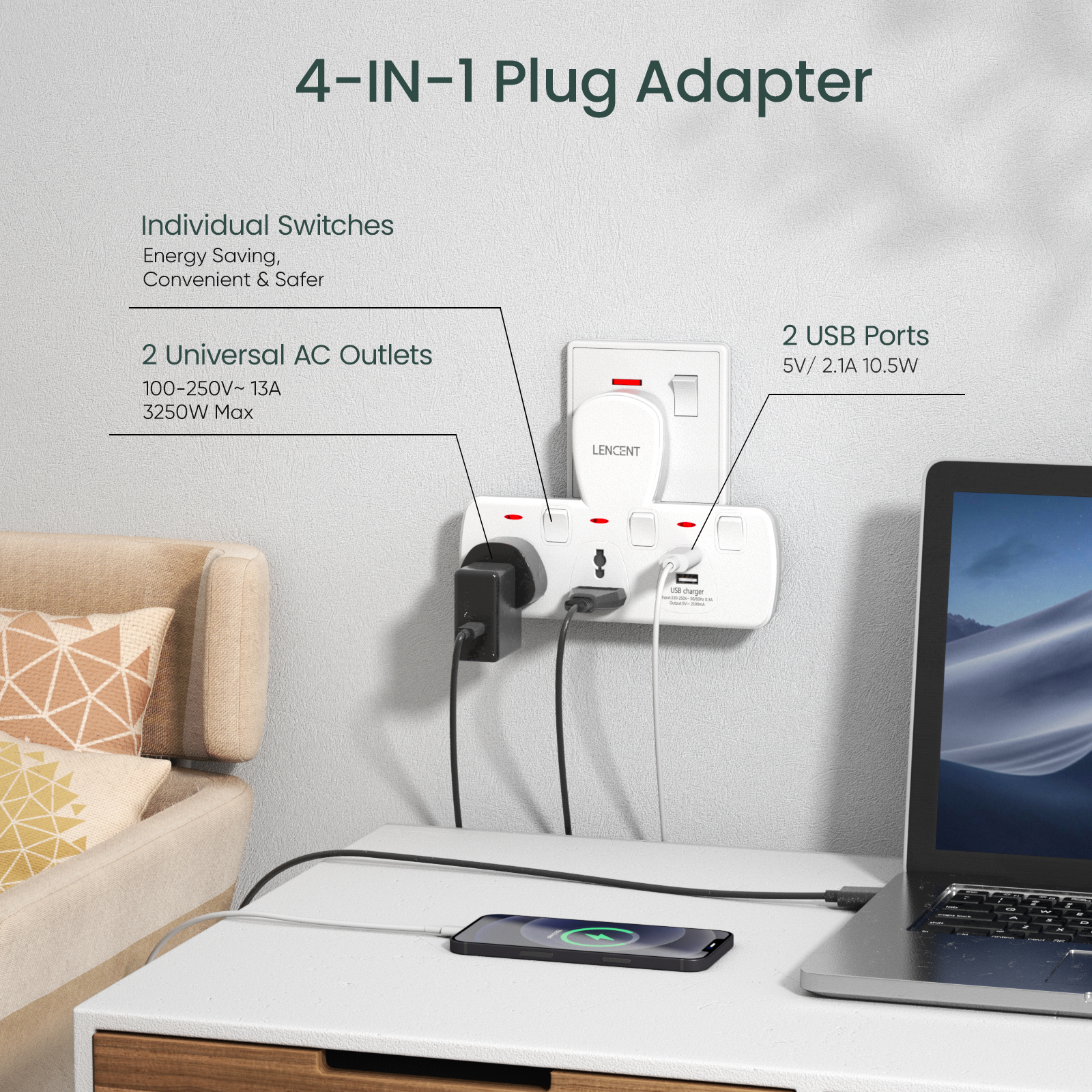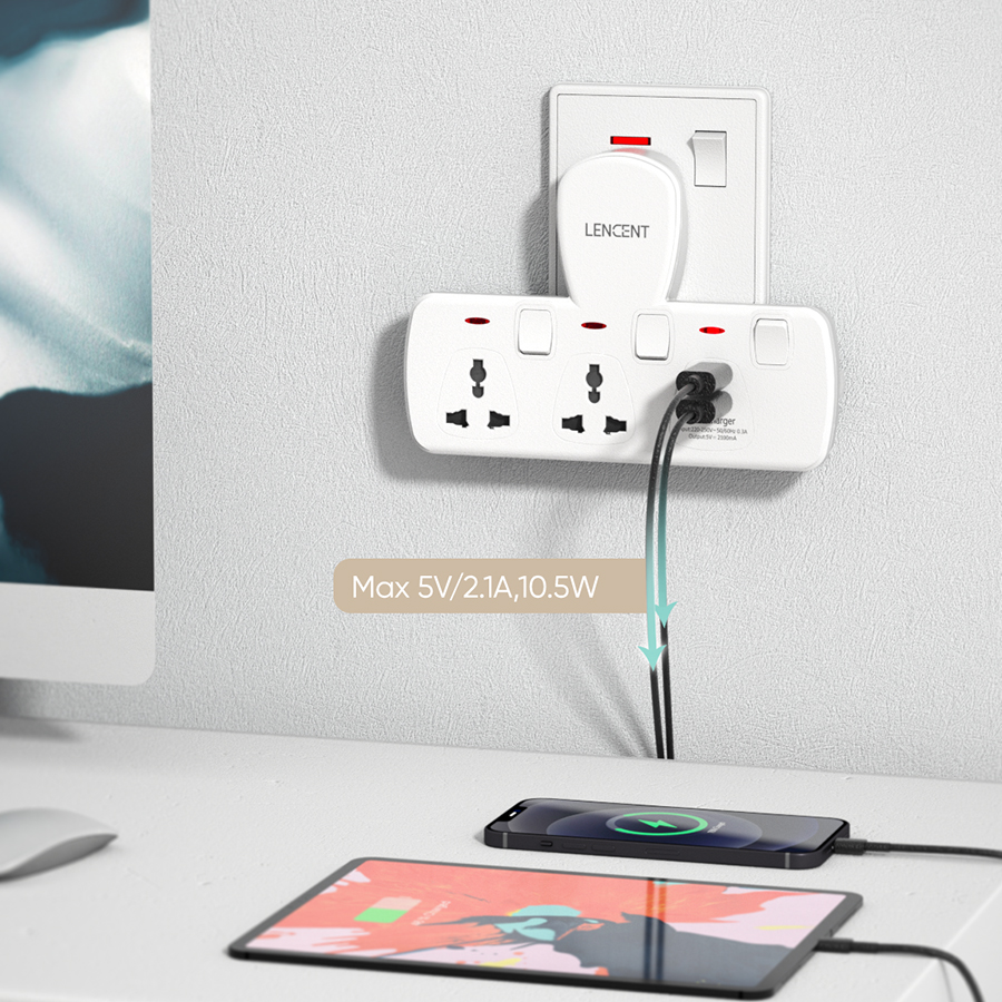 Lencent Plug Extension 4 in 1 USB Wall Plug with Individual Switches, 2 Outlets with 2 USB Ports, Multi Plug Outlet, 5V 2.1A USB Power Plug Adapter, Multiple Socket Charger Extension for Home, Office,
