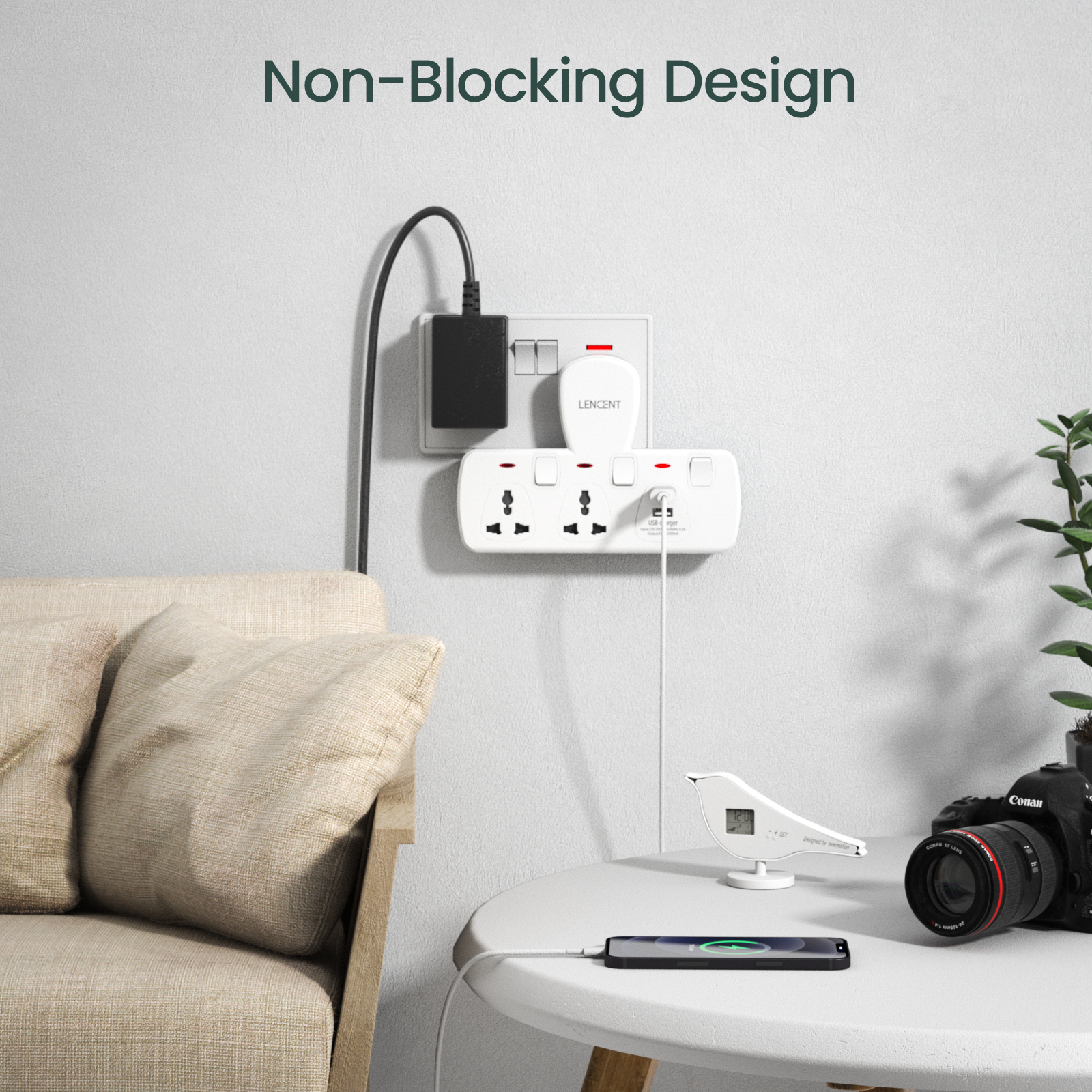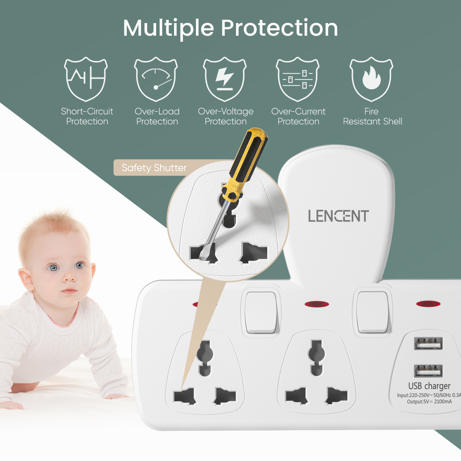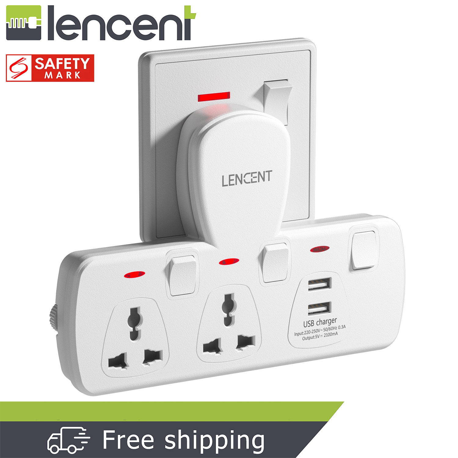 Lencent Plug Extension 4 in 1 USB Wall Plug with Individual Switches, 2 Outlets with 2 USB Ports, Multi Plug Outlet, 5V 2.1A USB Power Plug Adapter, Multiple Socket Charger Extension for Home, Office,