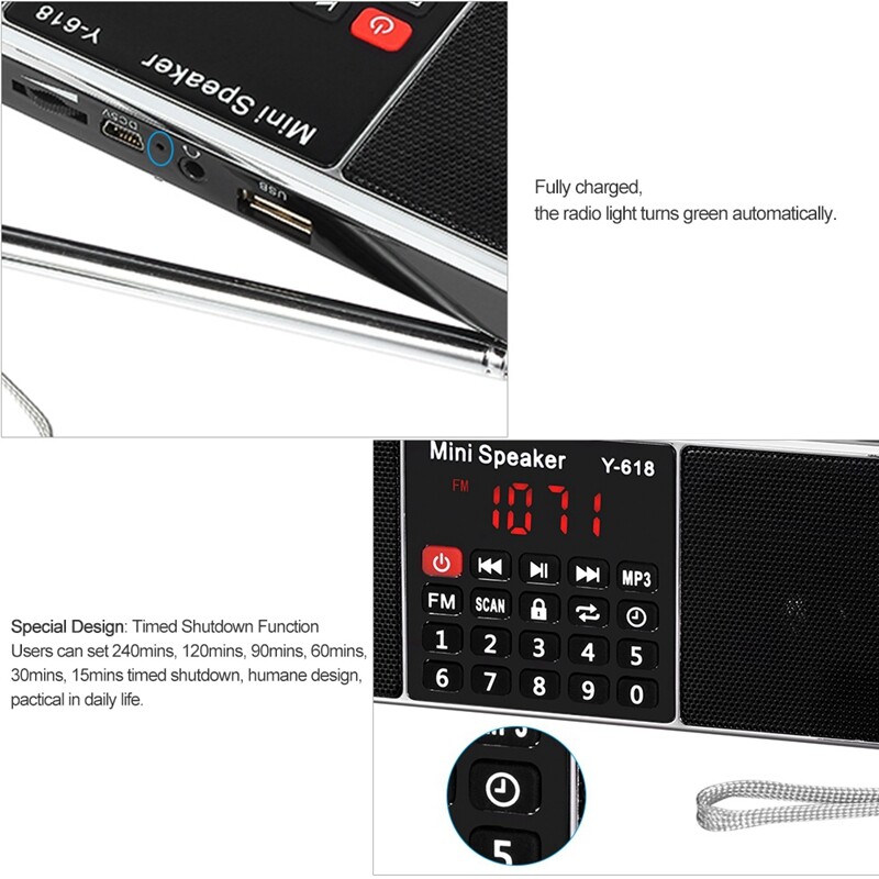 Features:[FM Radio Speaker]With high quality FM Radio signal, mini radio speaker can search channels automatically. Number buttons are for MP3 selection and FM Radio station easily. Direct manipulation and get started quickly.[High Fidelity Sound Quality]With dual 3W speakers, loud sound and high fidelity sound quality is perfectly suitable for the aged. It's also available for earphones connected with 3.5mm earphone jack.[TF / SD Card & U Drive]As a speaker, it can play music from TF / SD card and U drive. In MP3 mode, when powered off, it can playback the current MP3 when powered on next time.[Convenience]With 2 inch diaplay screen and unique plastic buttons, user-friendly, durable and eco-friendly. Lanyard design is convenient for you to take outside. And the timed shutdown function helps you in daily life.[Endurance Time]Replaceable 1000mAh battery also can be charged via included Mini USB charging cable; large battery capacity supplies long standby time, which gives you music enjoyment all the day.Y-618 Mini FM Radio Speaker is specially designed for people who are free to listen to radio, weather, and news at home. Loud sound and high fidelity sound quality makes you enjoy favorite music at anytime and anywhere. It is really cool and trendy to enjoy music with this multi-functional stereo digital speaker.Specification:Power Supply: Rechargeable Battery PackStyle: PortableScreen: YesPackage: YesBluetooth: NoMaterial: ABSWIFI: NoFunction: Built-In SpeakerType: FMModel Number: Y-618Display Screen: 2 InchFM: 87.5 MHZ-108 MHZDecoding Range: 8-320 KbpsFrequency Range: 120 Hz-20 KHzDistortion: 1.5W=1%, F=1 KHzOutput Power: 2 * 3W (max)Speaker Size: 40mm 16core internal magneticPower Input: DC 5V / 500mAOutput Impedance: 4